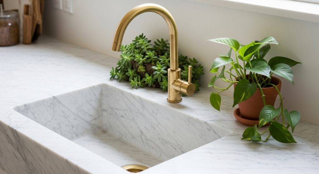 For a more refined boho feel, a white marble sink with gold or brass details adds subtle luxury while staying organic.