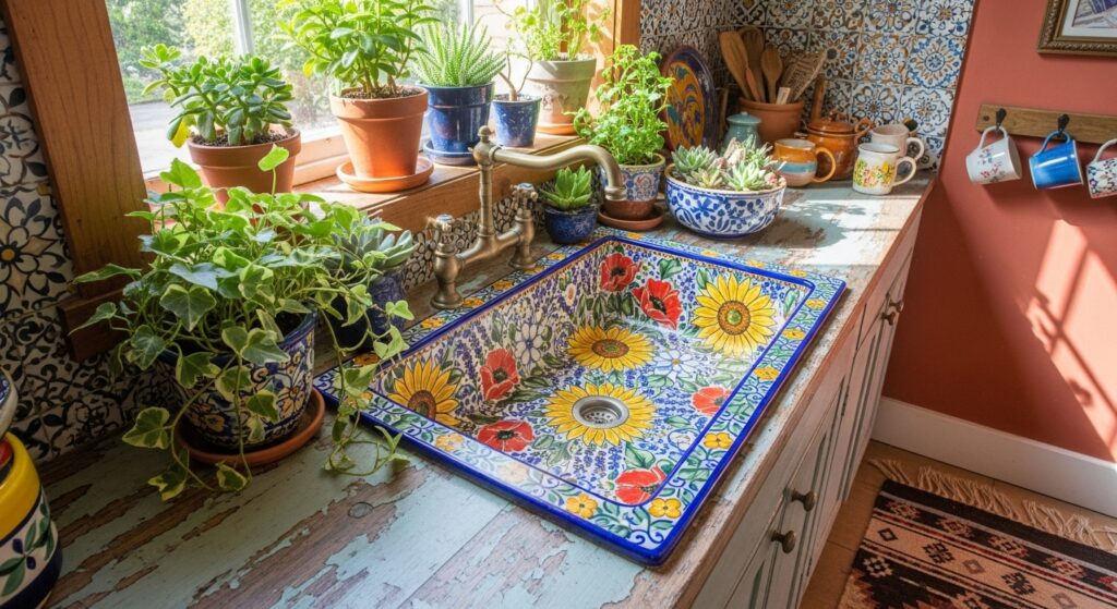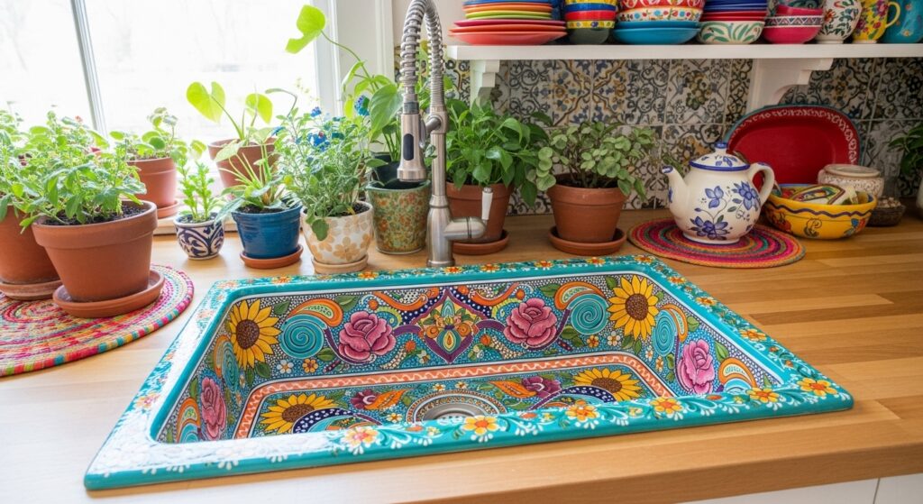 A floral painted sink celebrates craftsmanship and color. Each bloom tells a story of life, love, and creativity — the heart of boho spirit.