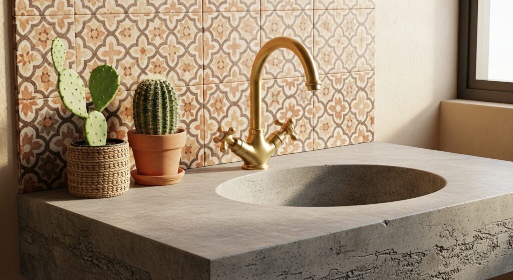 A patterned or textured concrete sink merges industrial chic with bohemian flair. Add brass fixtures and cactus plants for a southwestern touch.