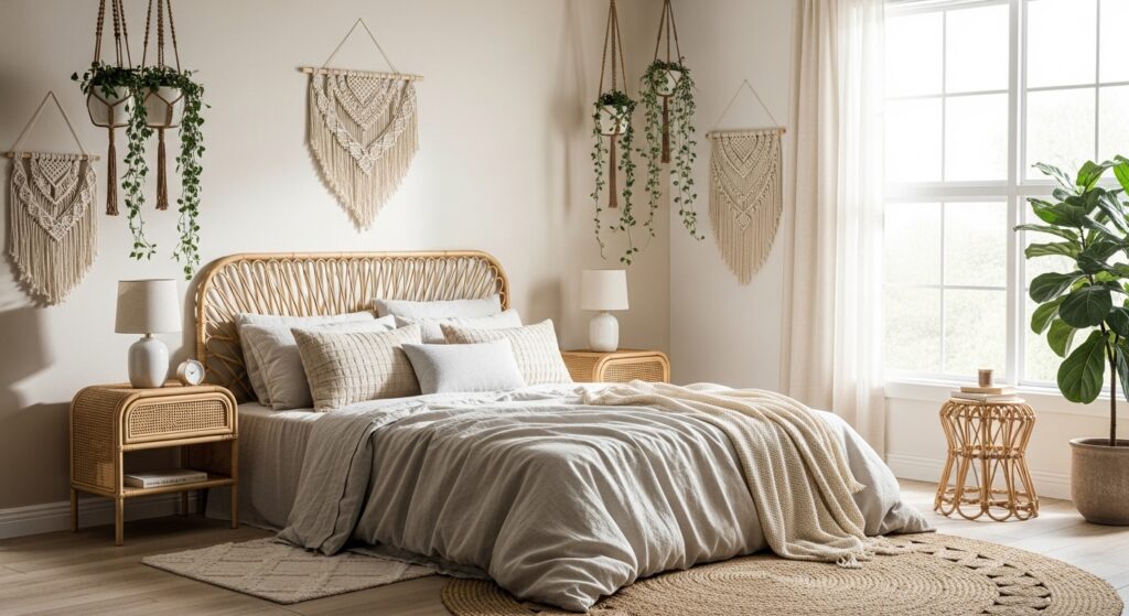 Soft beige tones, rattan furniture, and macramé accents make this neutral boho bedroom the epitome of calm. Layer natural textures like linen and jute rugs for a cozy, grounded vibe. Add hanging planters to bring in organic beauty.