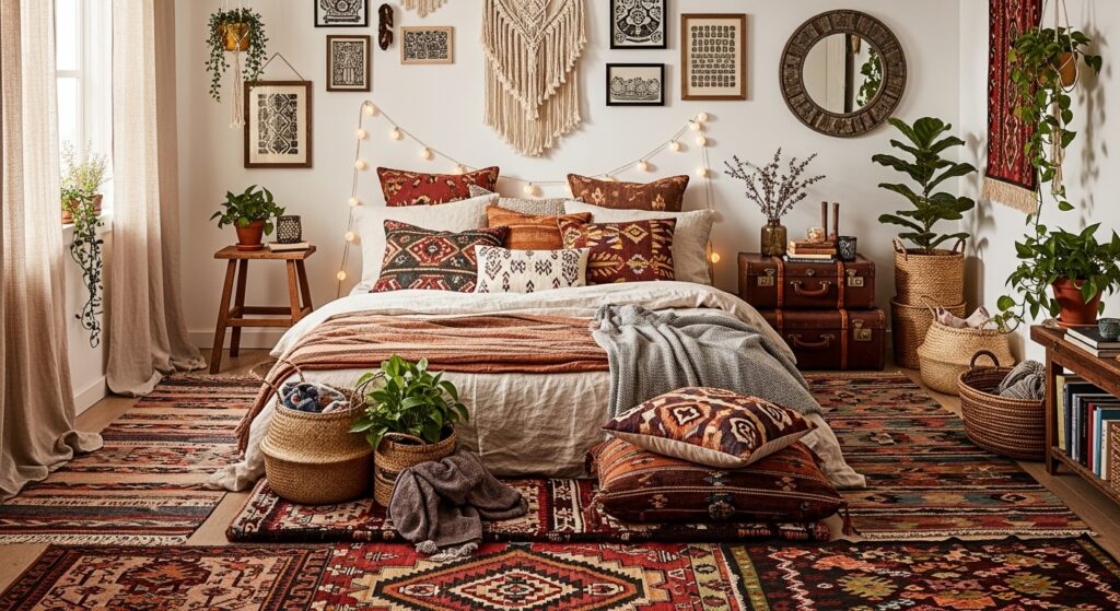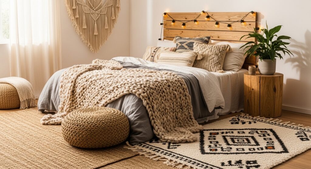 The key to true boho comfort lies in layering — pile up rugs, throw blankets, and pillows in varied textures to create depth and warmth.