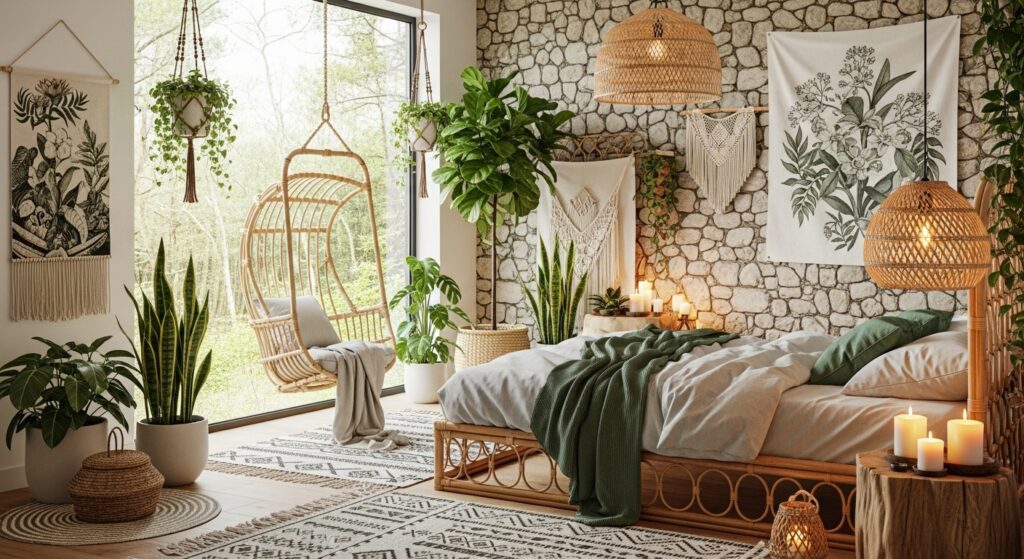 Bring nature inside with rattan furniture, stone accents, and neutral tones. A large window or natural light completes the earthy vibe.