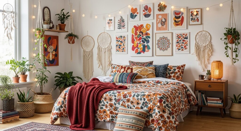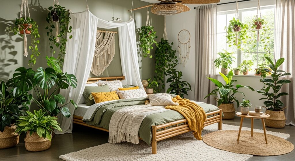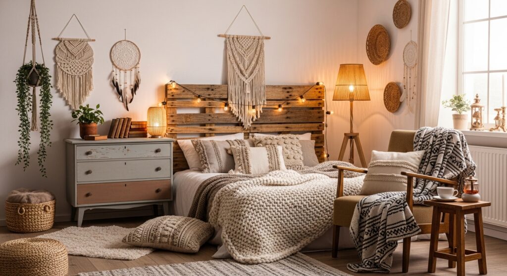 Upcycle old furniture with paint, add handmade macramé, or use thrifted finds to personalize your boho space affordably.