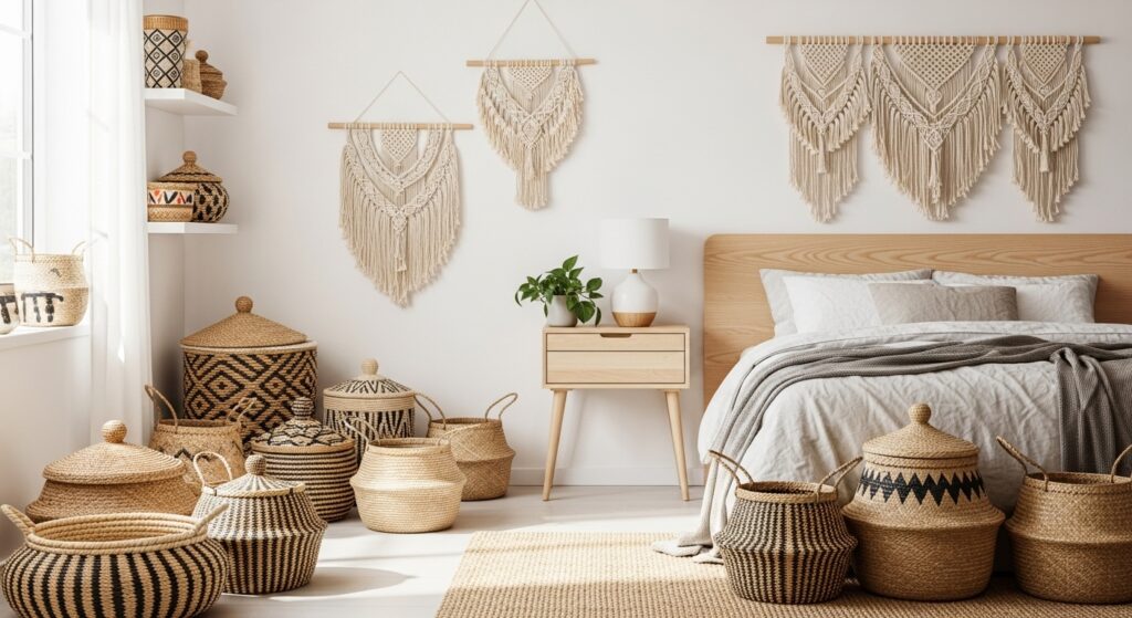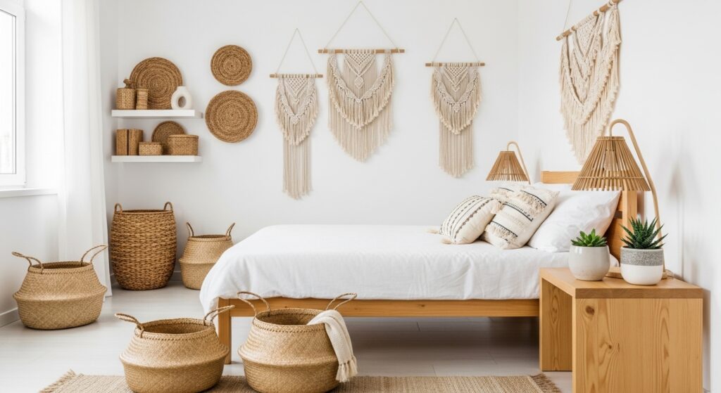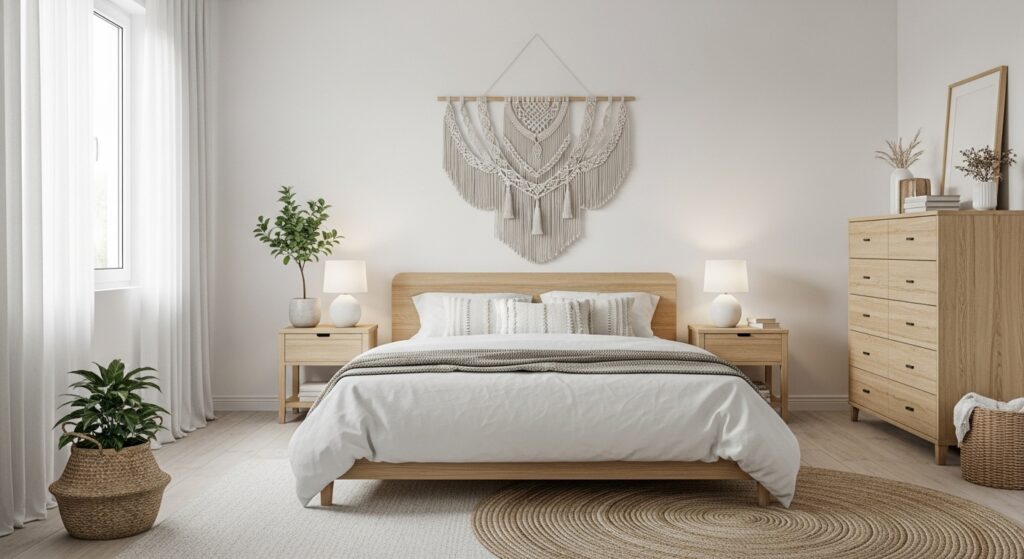 Keep it clean and serene with crisp white bedding, light wood, and subtle boho details. A simple macramé wall hanging and woven baskets add warmth without clutter. Perfect for small spaces.
