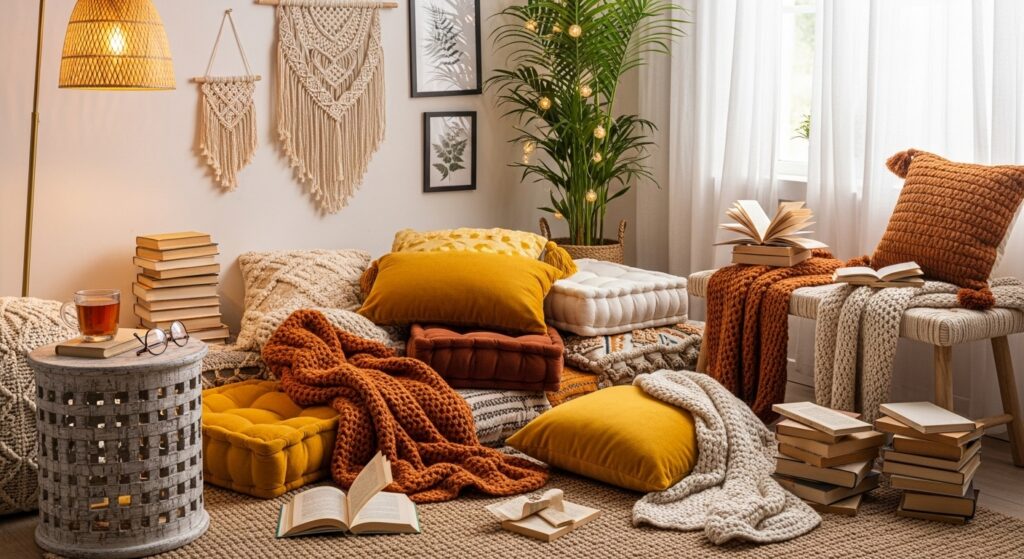 Create a small nook in your bedroom for reading or journaling. Add a floor cushion, low table, and soft throws for a snug vibe.
