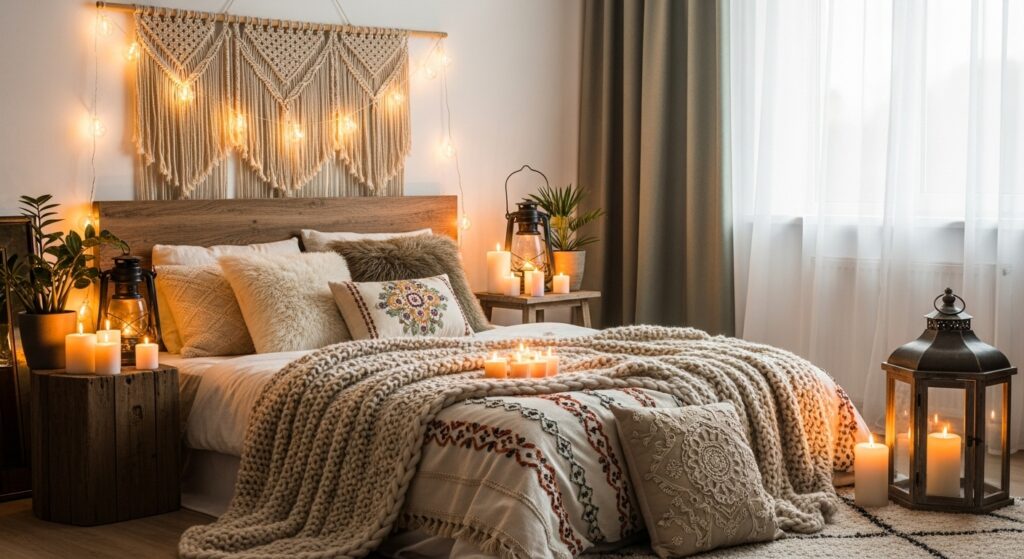 Soft lighting sets the tone for comfort. Add string lights, candles, and lanterns around your bed to create a dreamy evening glow perfect for relaxing nights.
