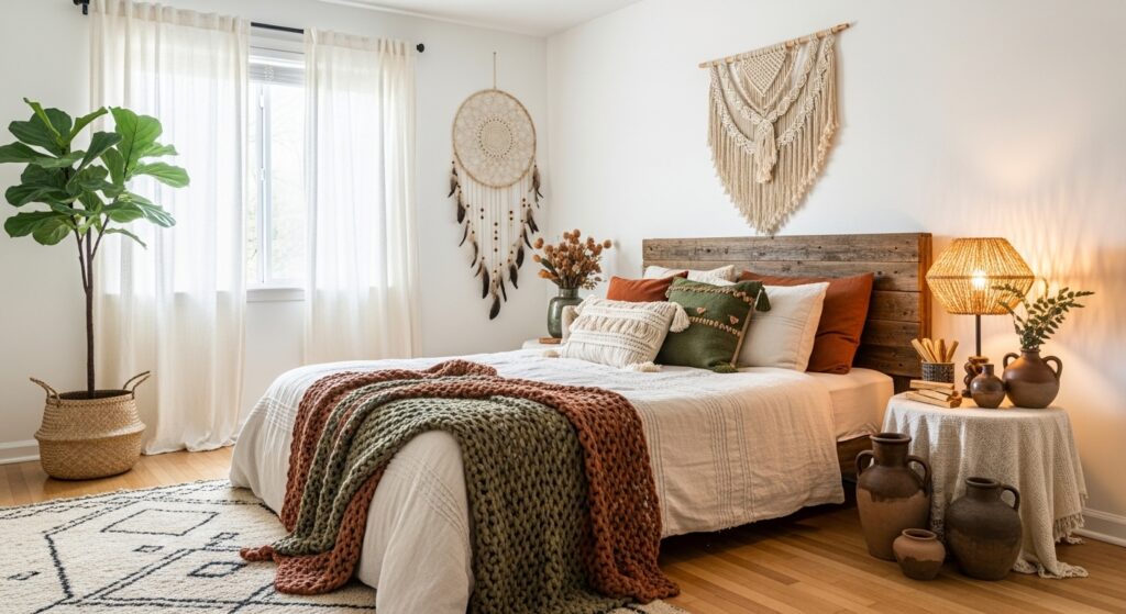 Combine minimalist Scandinavian style with cozy boho details — white walls, wood tones, and neutral layers for a balanced, airy space.