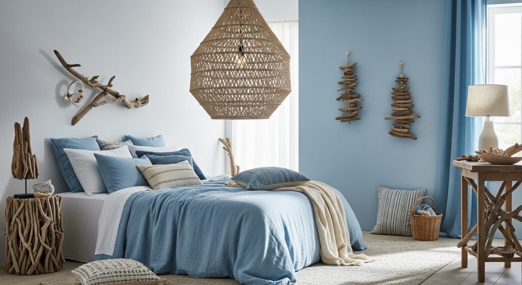 Blend beachy whites, light blues, and sandy beige for a breezy, relaxed vibe. Add woven light fixtures and driftwood decor for that seaside touch.