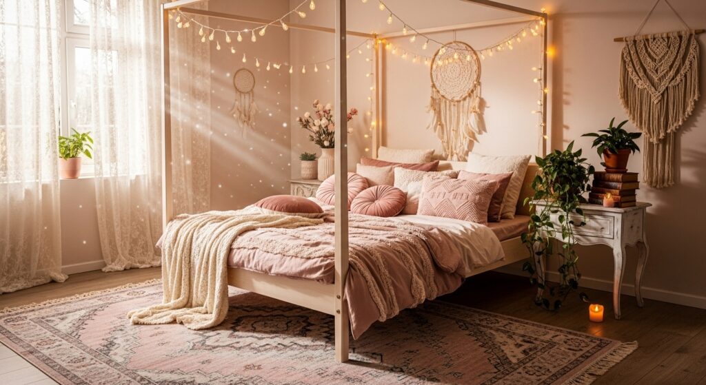 Soft blush tones, lace curtains, and fairy lights bring a romantic feel to your space. Add velvet cushions and delicate wall art to complete the look.