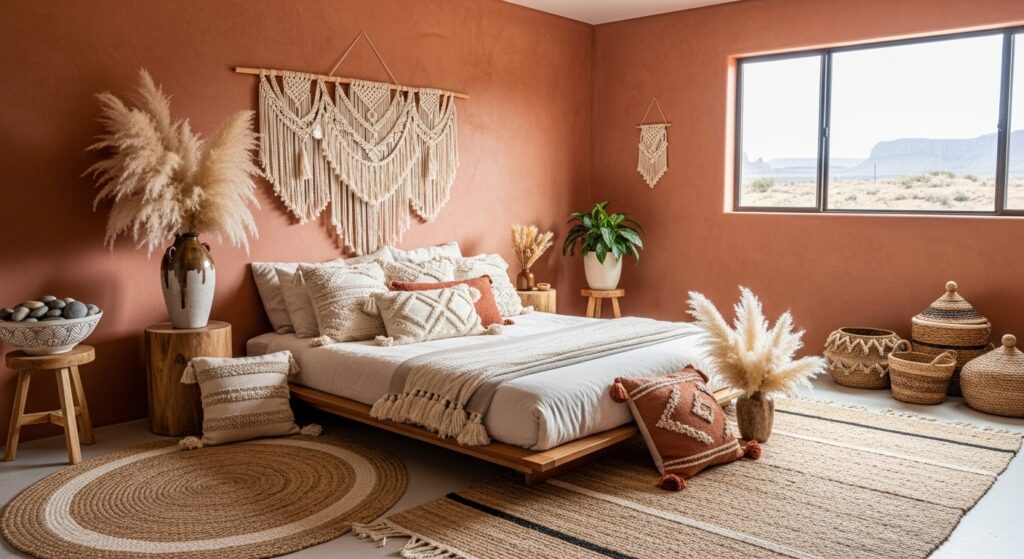 Warm terracotta walls, textured throws, and woven decor bring in desert charm. Use clay pots, dried pampas grass, and earth-toned bedding for a relaxed Southwestern vibe.