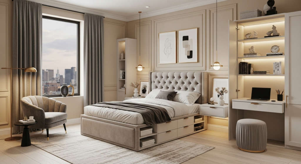 For a luxury look, choose upholstered beds or wooden frames with built-in drawers. Neutral fabrics, soft textures, and seamless design create a hotel-inspired aesthetic that feels organized, spacious, and refined.