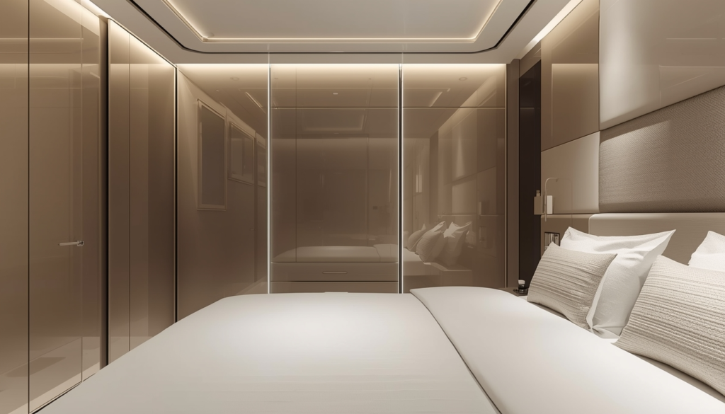 Choose sliding doors, glossy finishes, or handle-less panels to enhance the luxury feel. Light colors and mirrored surfaces further open up the room, giving it a modern, high-end look loved by Pinterest audiences.