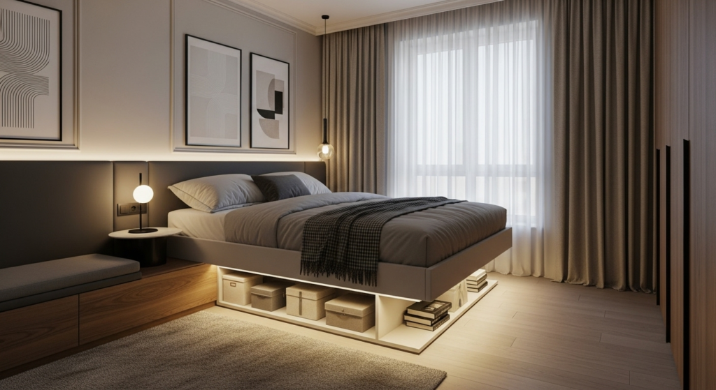 Under-bed storage is a powerful space-saving idea that keeps small rooms clean and visually calm. This hidden area can store seasonal clothing, extra bedding, or accessories without adding visible clutter. It helps maintain a neat environment while making the most of unused space.