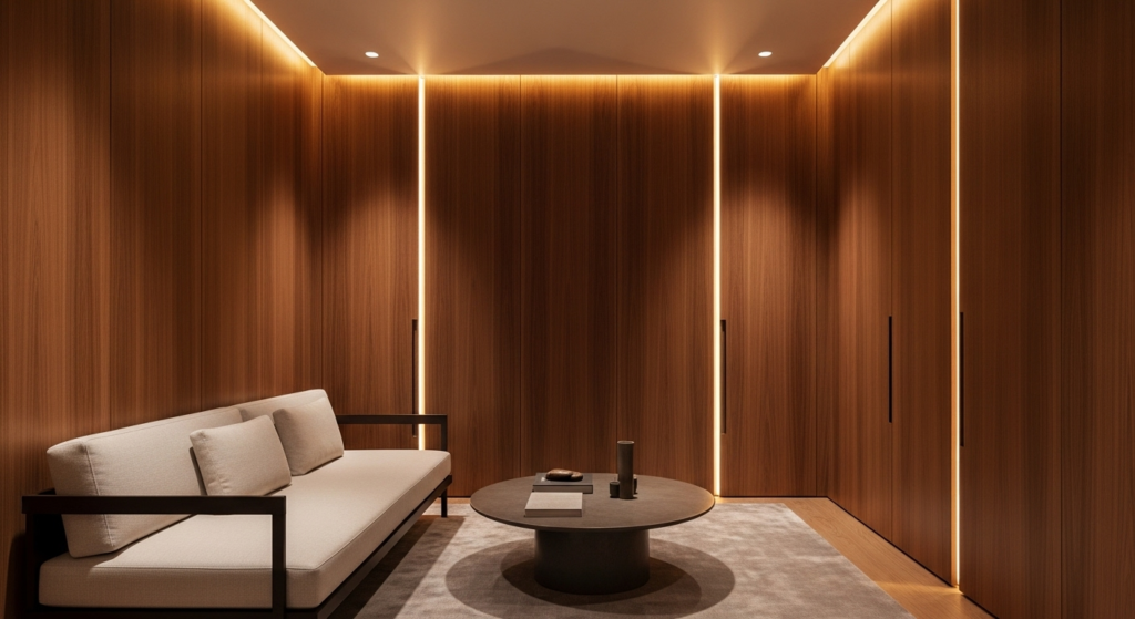 Hidden storage behind wall panels is a sleek solution for maintaining a clean, uncluttered look. This design keeps everyday items out of sight while preserving a smooth, minimalist appearance in small rooms.