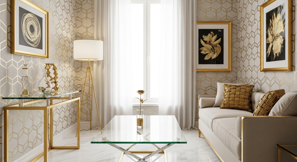 Choose tempered glass with sleek metal or gold-accented frames for a high-end feel. This combination keeps the room open, modern, and effortlessly sophisticated.