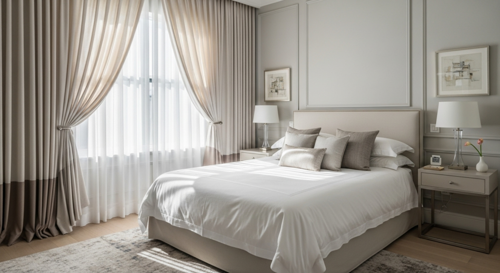 Choose sheer or lightweight fabrics in neutral shades for a luxurious effect. When paired with subtle lighting, curtains create an elegant, hotel-style atmosphere.