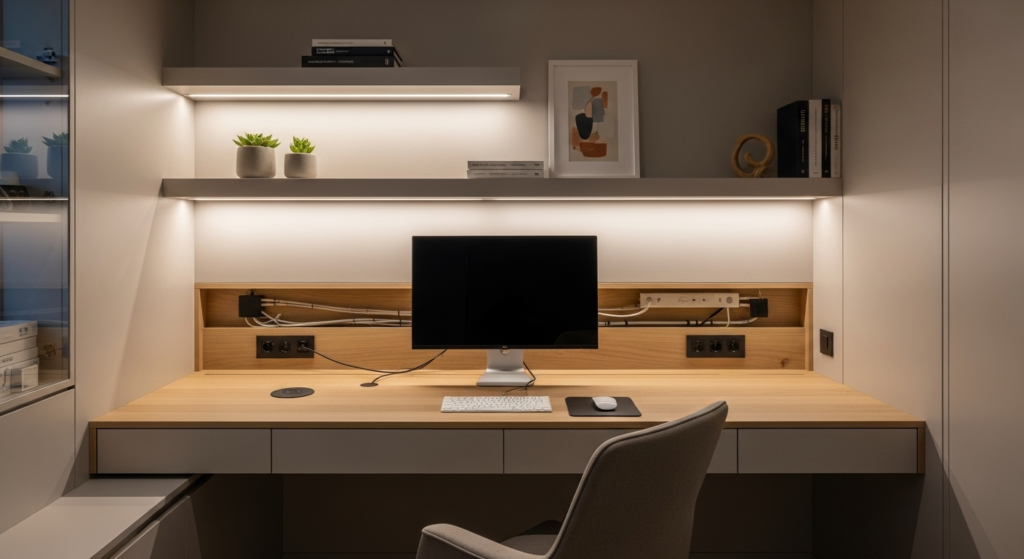 Managing cables and tech clutter is essential in small rooms. Hidden cable systems, wall-mounted outlets, and discreet storage keep electronics organized and out of sight, maintaining a clean aesthetic.
