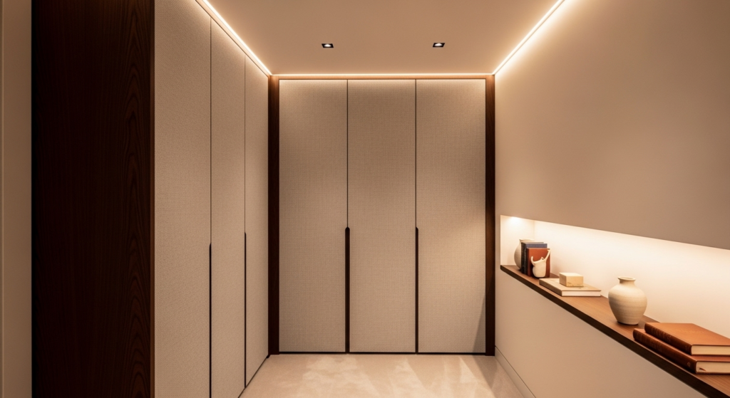 Opt for handle-less panels, wood finishes, or soft-touch surfaces for a premium feel. The result is a seamless, luxury interior that feels calm, organized, and spacious.
