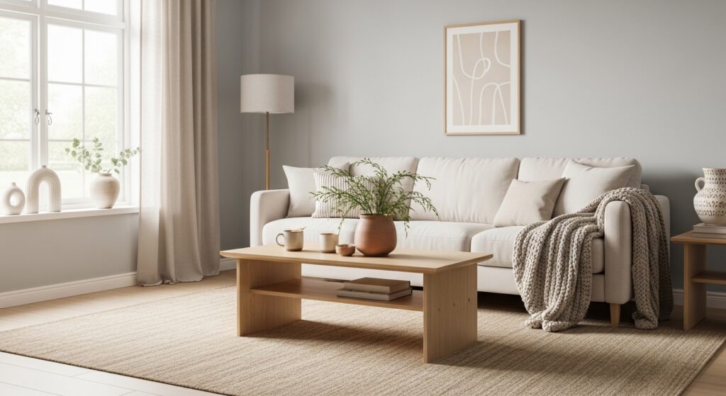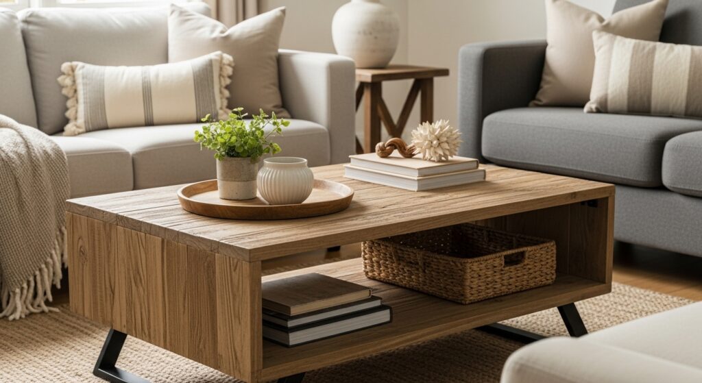 Pairing the table with candles, books, or small decorations enhances its visual appeal. This sturdy centerpiece creates a grounded, comfortable feel that anchors the entire room’s design.