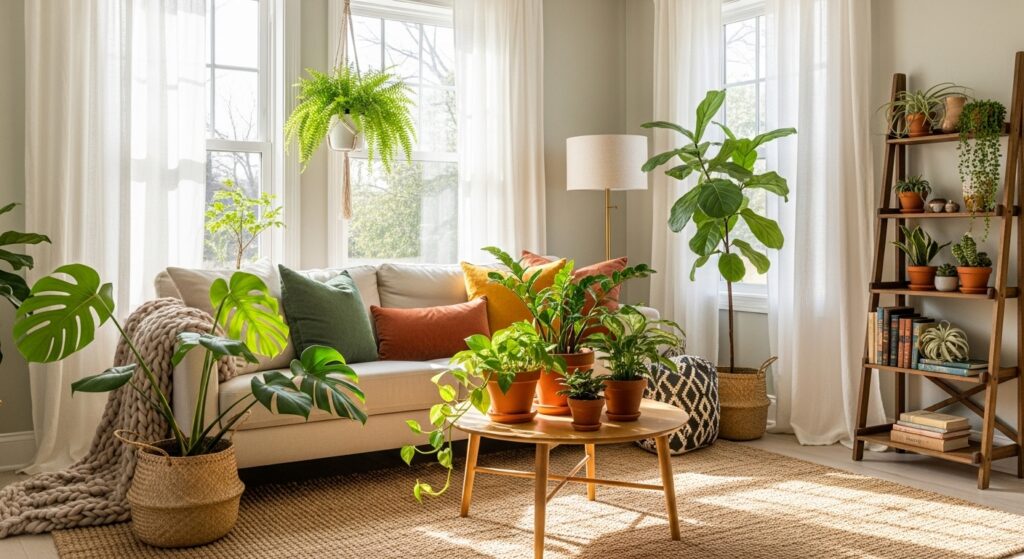 Plants add natural beauty, softness, and an uplifting energy to any living room. Their organic textures contrast wonderfully with furniture, creating visual balance. Lush green leaves help the room feel vibrant without being overwhelming.