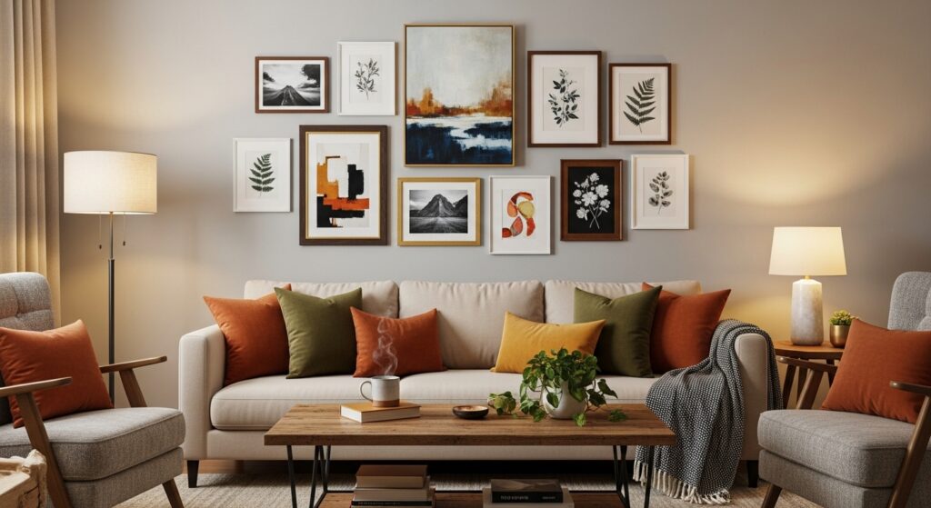 Mixing frame sizes and styles adds interest without cluttering the wall. When curated carefully, a gallery wall ties the room together while enhancing comfort and visual appeal.