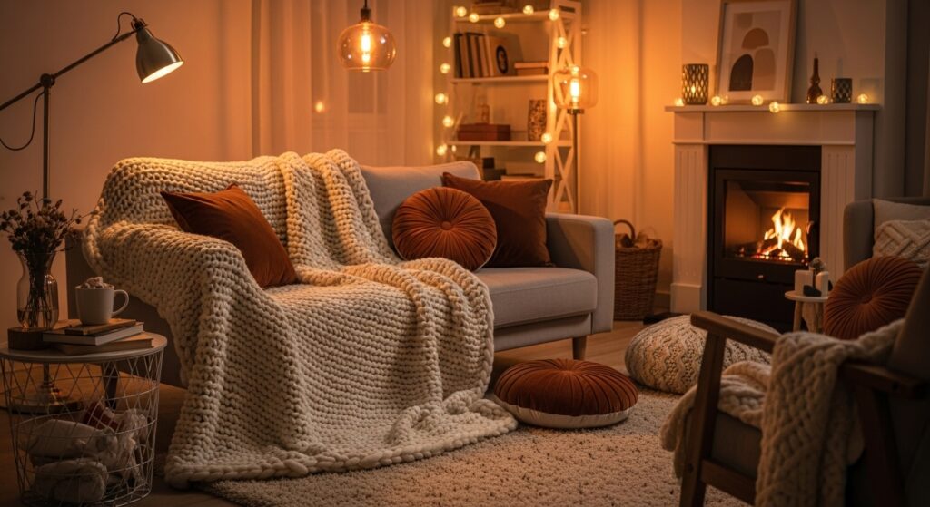 You can drape them casually over the back of your sofa or fold them neatly in a decorative basket. Textured materials such as faux fur, fleece, or chunky knit add tactile warmth that makes the space feel intentionally curated and extra inviting.