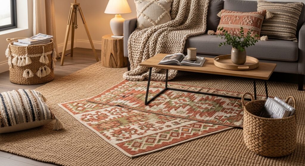 Choose complementary colors and textures to keep the room cohesive. A jute or wool base paired with a plush patterned rug creates a perfect balance between rustic style and modern comfort. This layered approach immediately makes the room feel more lived-in and homey.