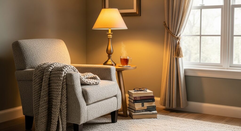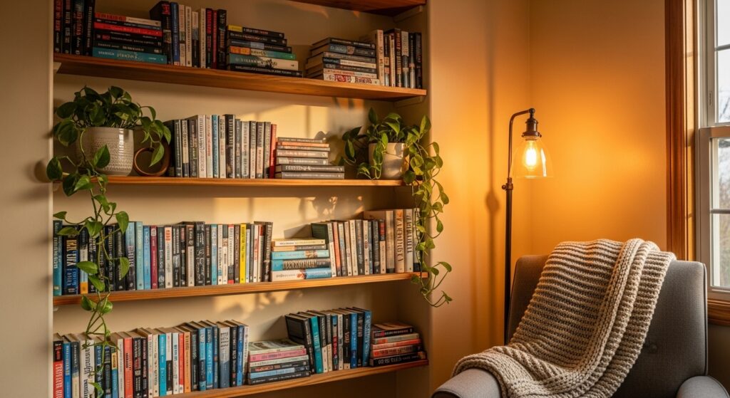 A reading nook transforms a simple corner into a relaxing retreat. A comfortable chair, soft throw, and warm light create an inviting place to unwind. Adding small shelves or a side table completes the space and keeps essentials within reach.