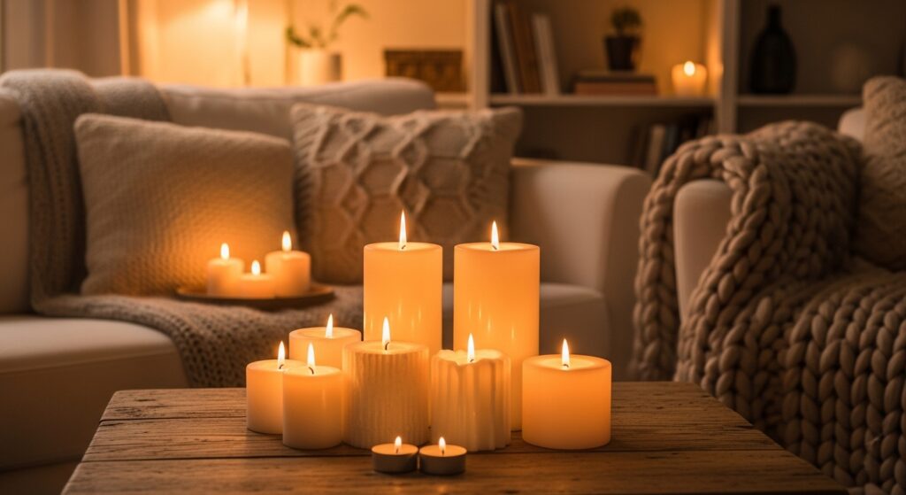 Candles bring warmth, aroma, and soft lighting that immediately enhance coziness. Scented candles create a comforting ambiance, while unscented candles add visual charm without overwhelming.