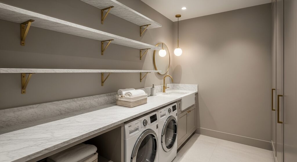 Add luxury to your laundry with marble shelving. Its natural veining elevates any modern interior.