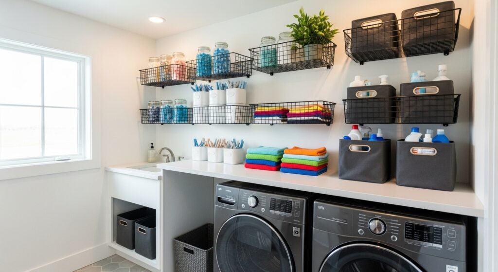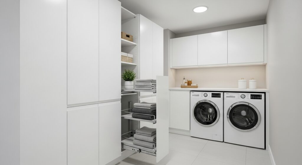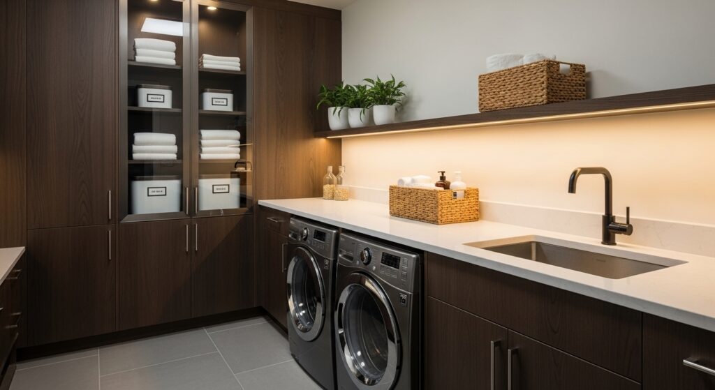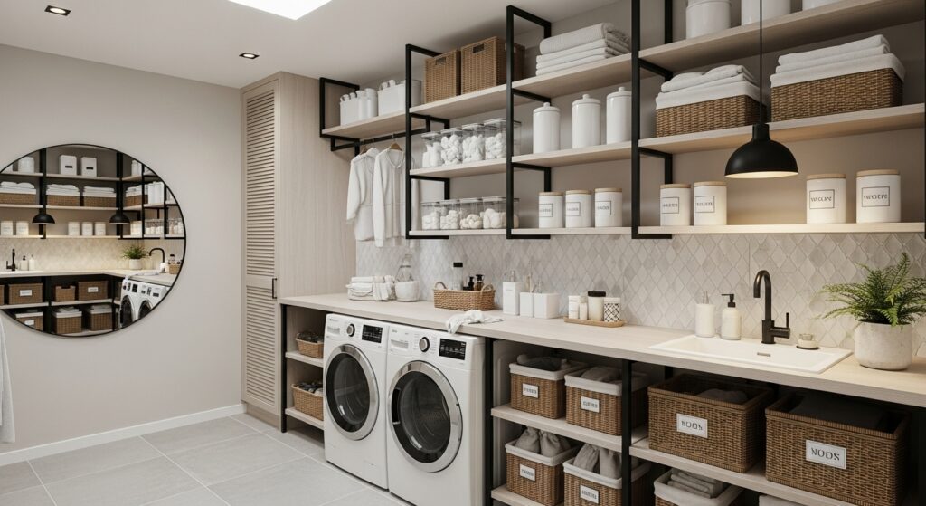 For a sleek, modern look, consider built-in cabinet shelving that seamlessly integrates into your laundry room layout. These units maximize vertical space and hide clutter beautifully.