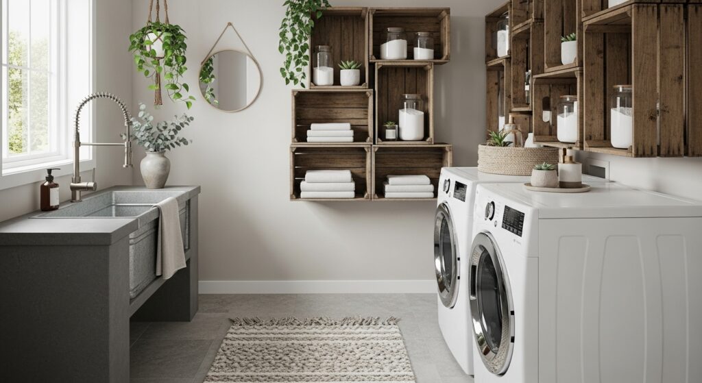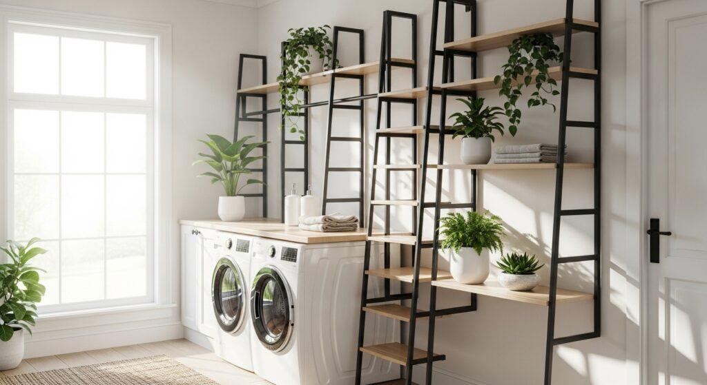 A ladder-style shelving unit provides a trendy yet functional twist for modern laundry spaces. It’s compact, mobile, and perfect for displaying neatly folded towels and plants.