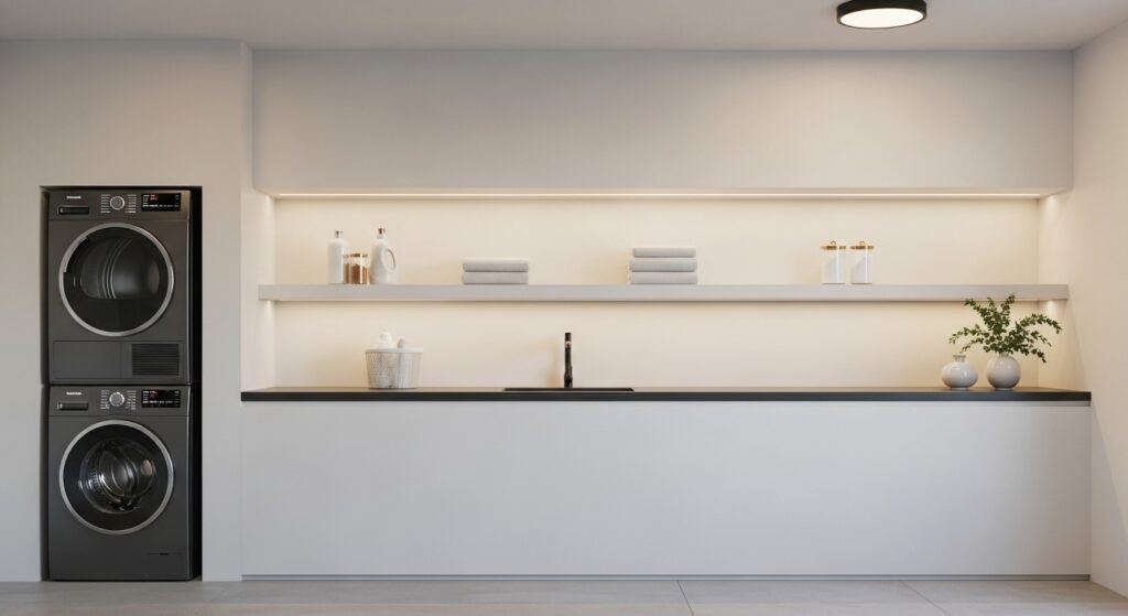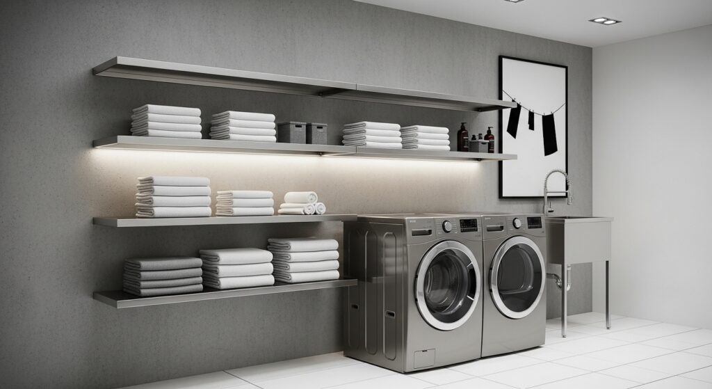 Add integrated LED lights beneath floating shelves for a futuristic laundry setup.