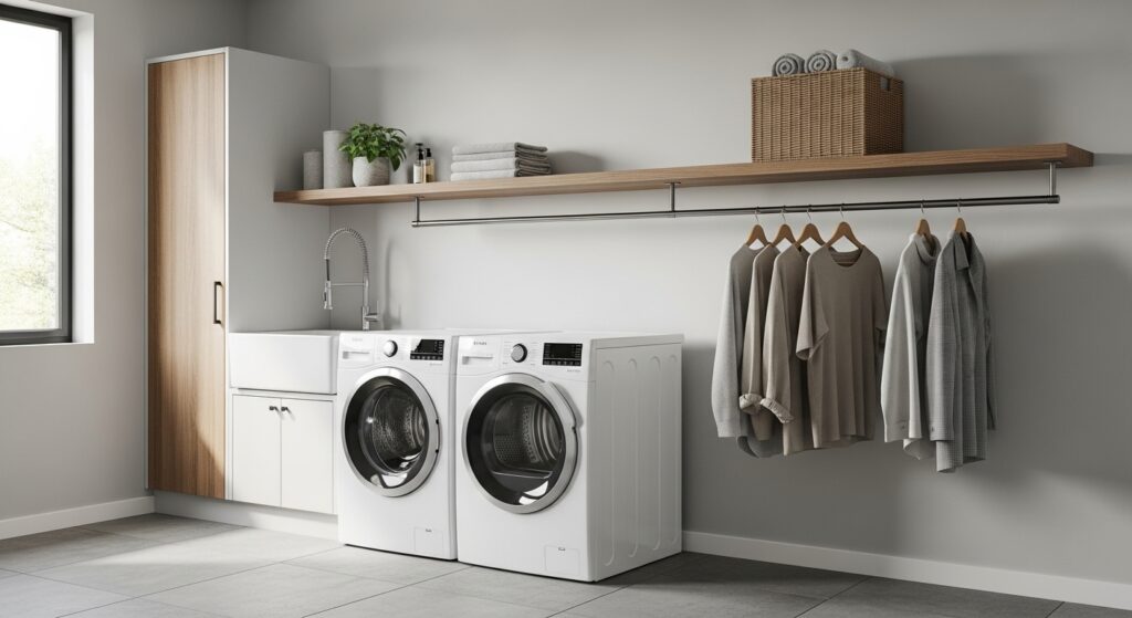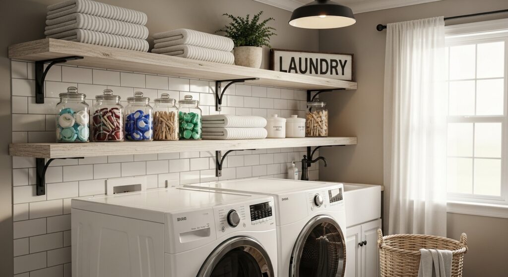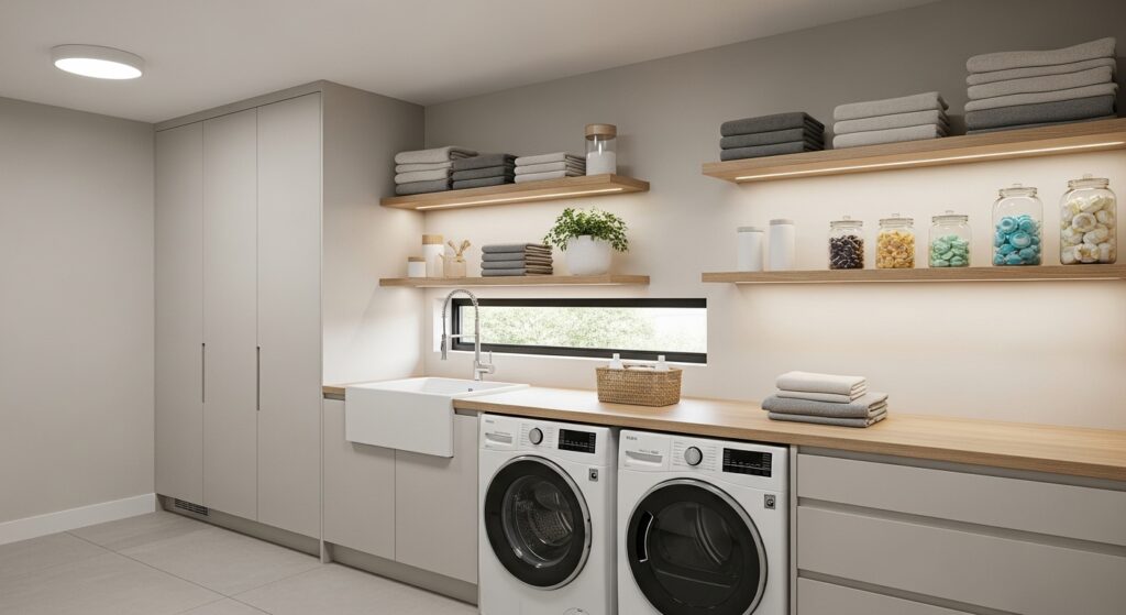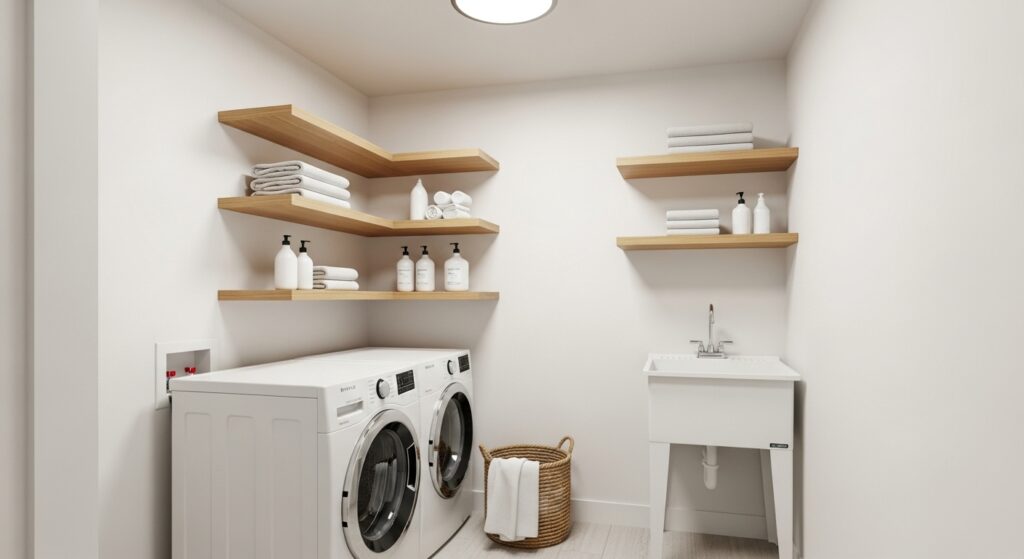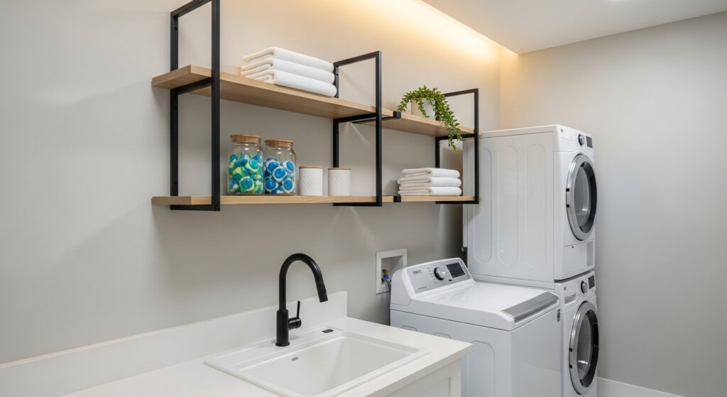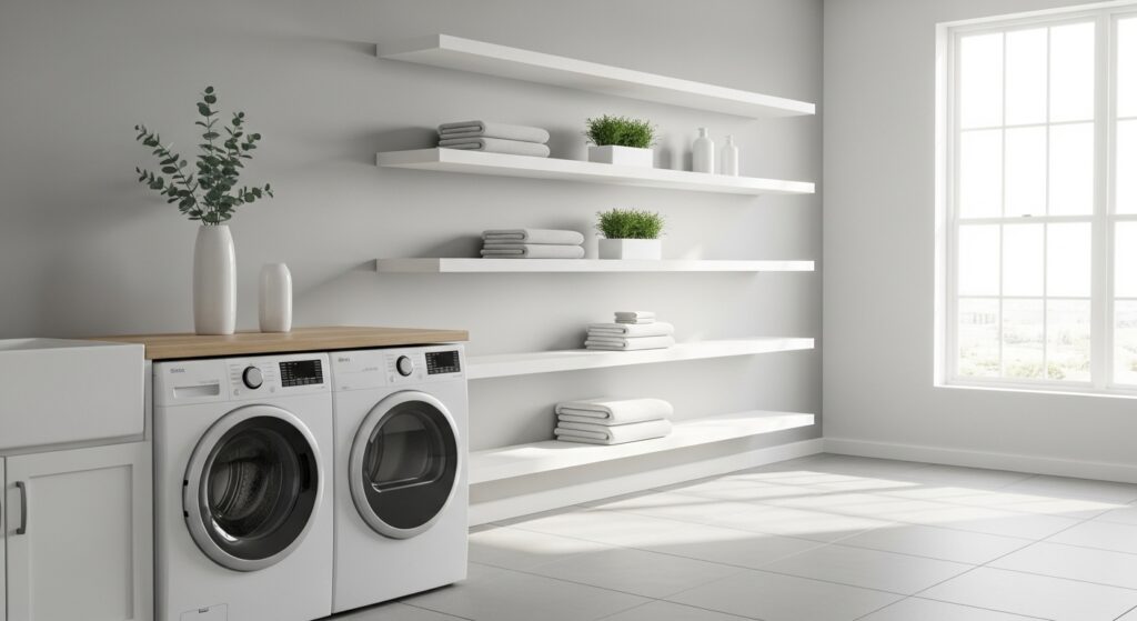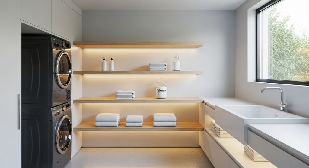 Simple, elegant, and practical—floating wooden shelves add warmth to a modern laundry space. They make detergents, baskets, and towels easy to reach while keeping a minimal aesthetic.