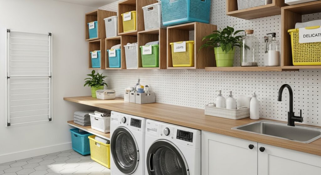 Add hooks for brushes, baskets for detergent, or shelves for decor—making your laundry wall both functional and fun.