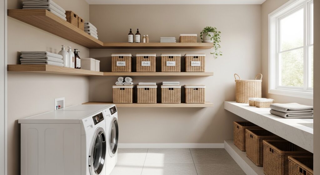 Bring cozy warmth to your laundry room with open shelving paired with wicker baskets. It’s a simple way to organize supplies while keeping an earthy, natural vibe.