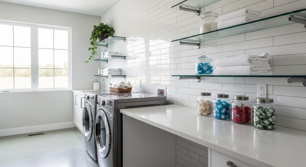 Glass shelves give your laundry area a sleek, airy feel. They reflect light beautifully and are perfect for small or dark rooms.