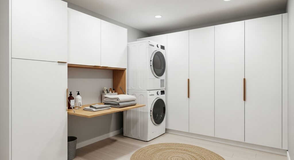 Pair light oak or walnut wood with white walls for a Scandinavian-inspired look. This design is perfect for small laundry rooms needing storage without bulk.