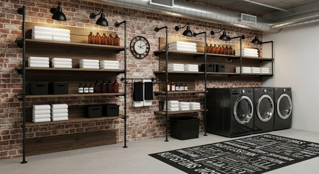 Industrial-style shelving made from metal pipes and reclaimed wood brings character to any laundry space. It’s both sturdy and visually striking.