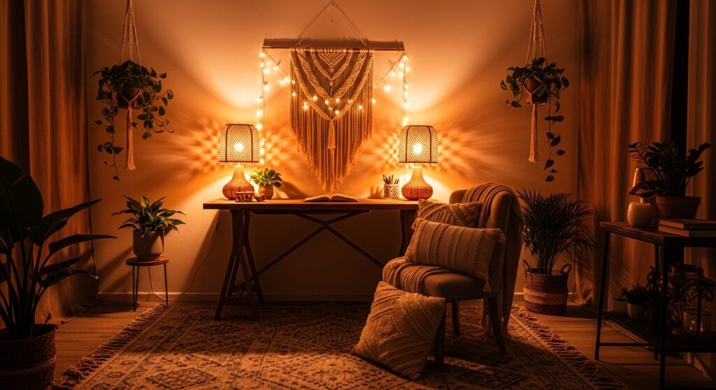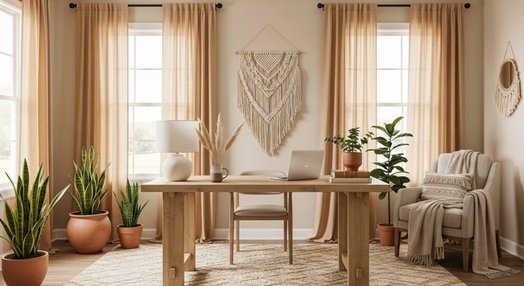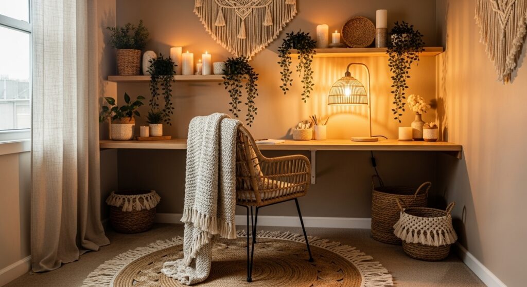 Transform a small corner into a boho office haven. Use floating shelves, warm lighting, and a woven throw over your chair. Compact yet inviting, it’s perfect for cozy productivity.