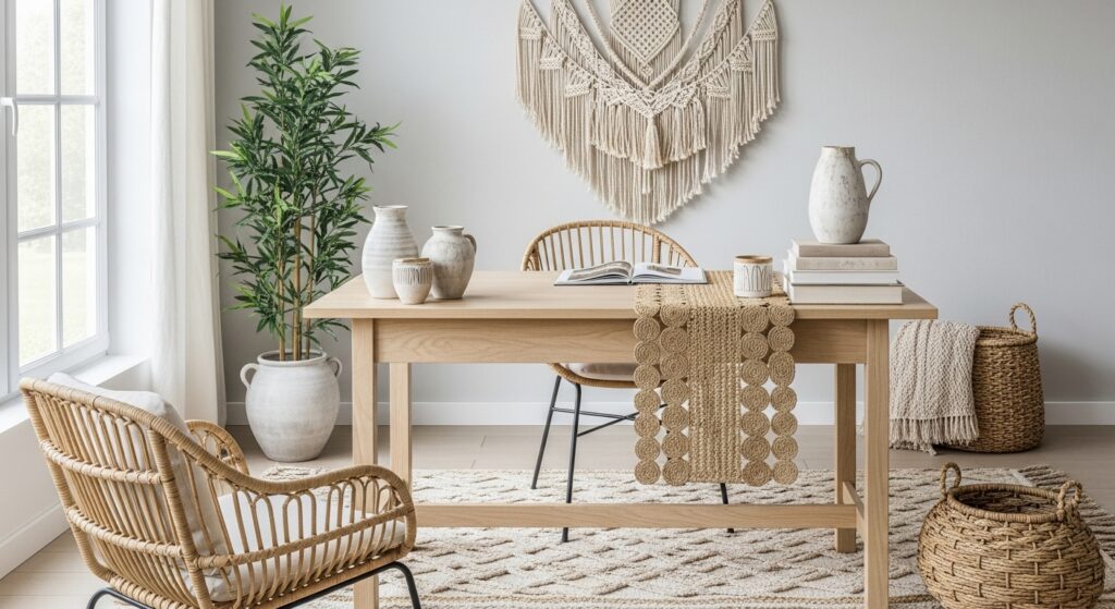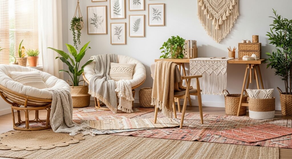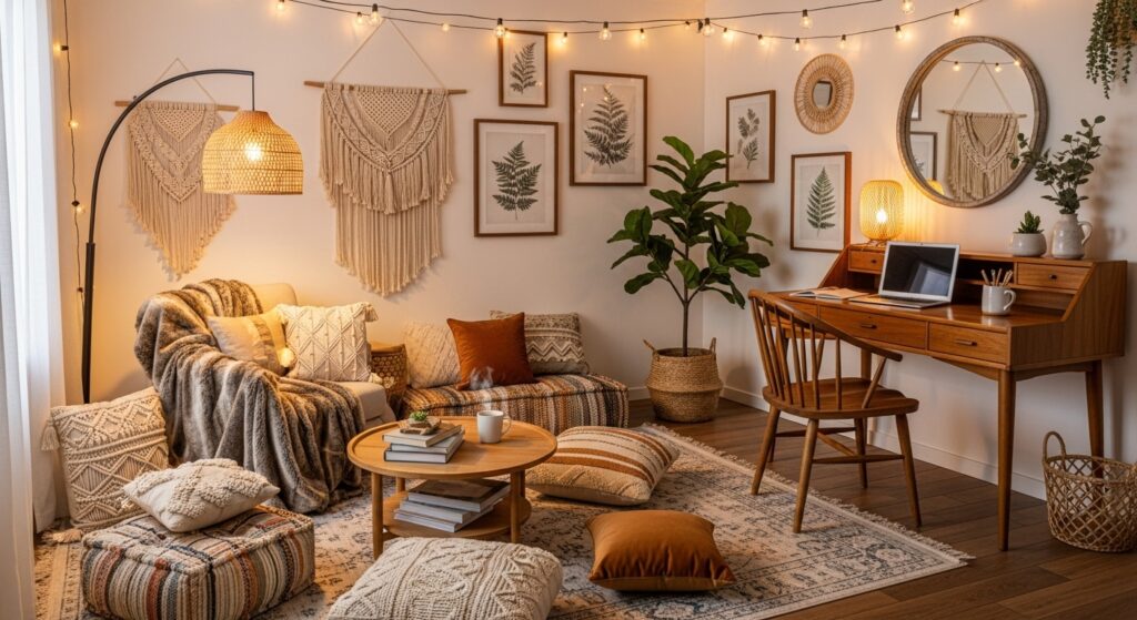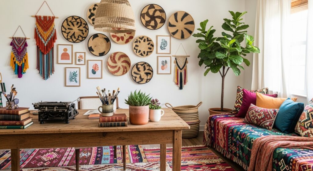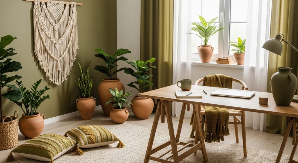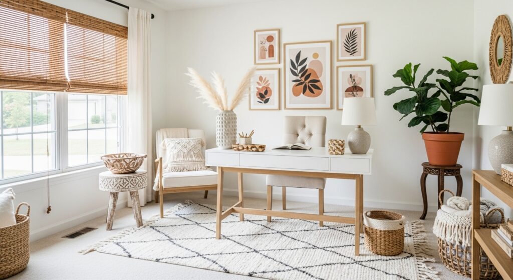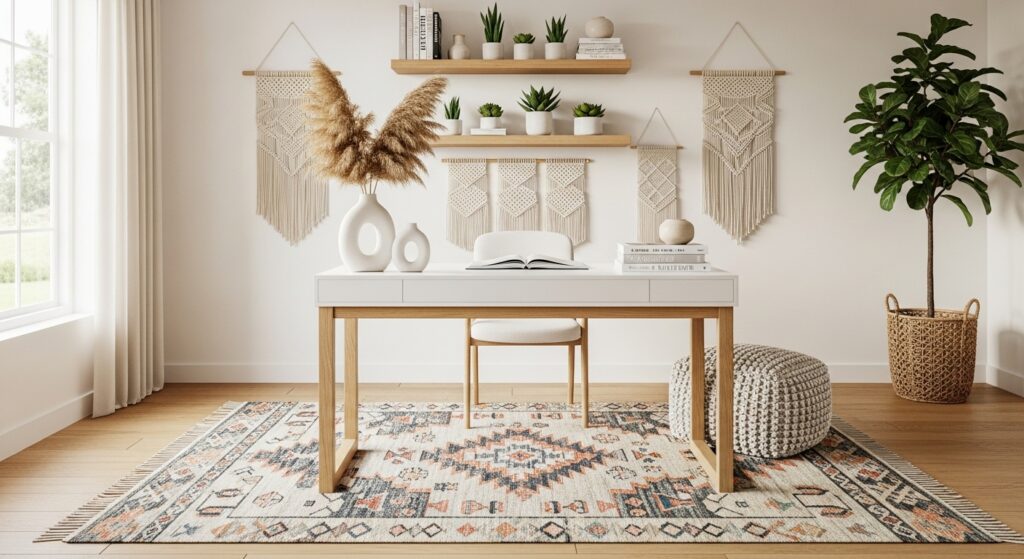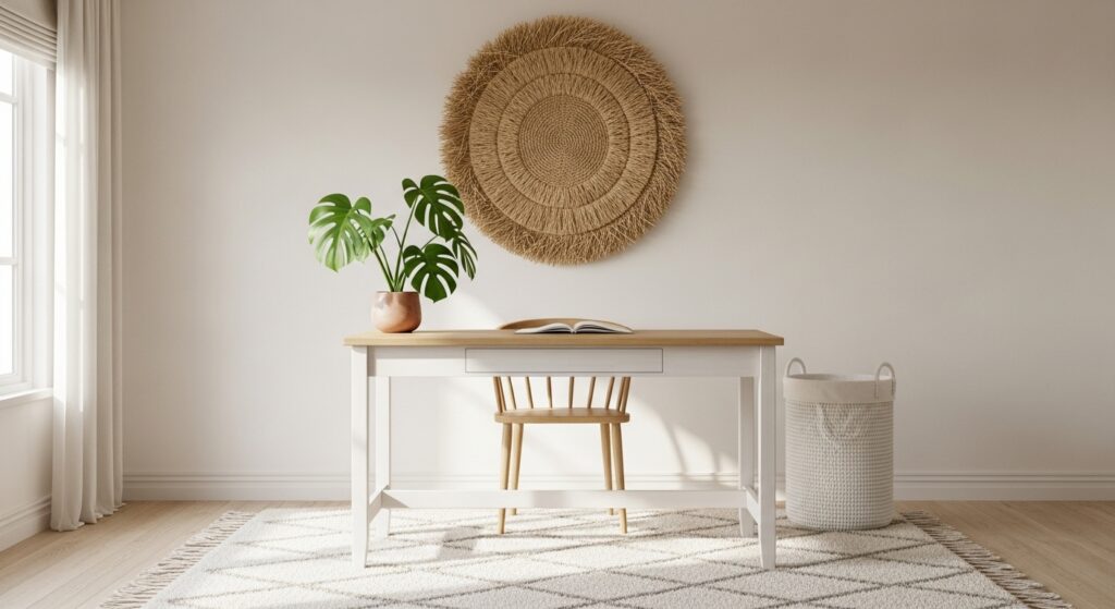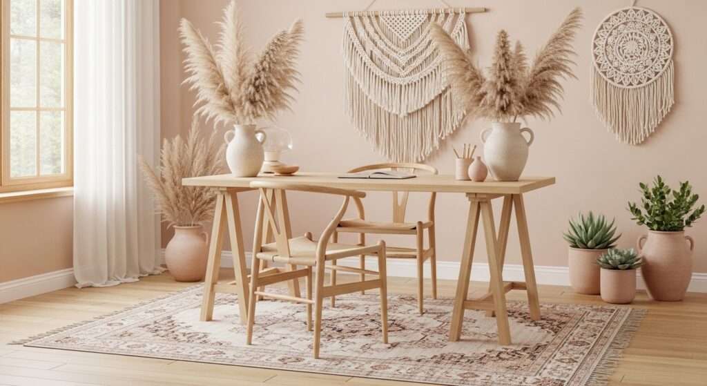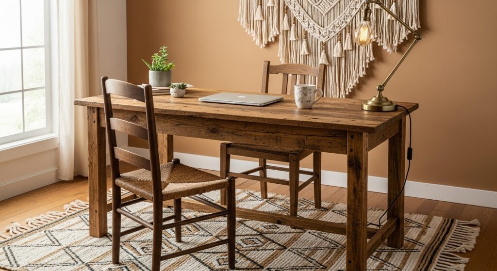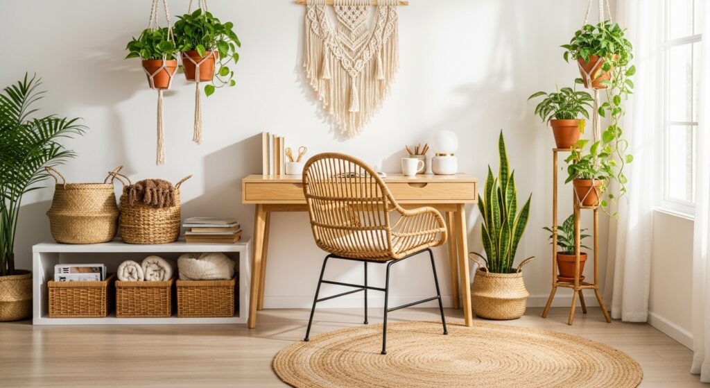 Highlight natural textures with reclaimed wood furniture. A rustic desk, woven rug, and greenery bring an earthy, grounded feel — ideal for cozy boho lovers.