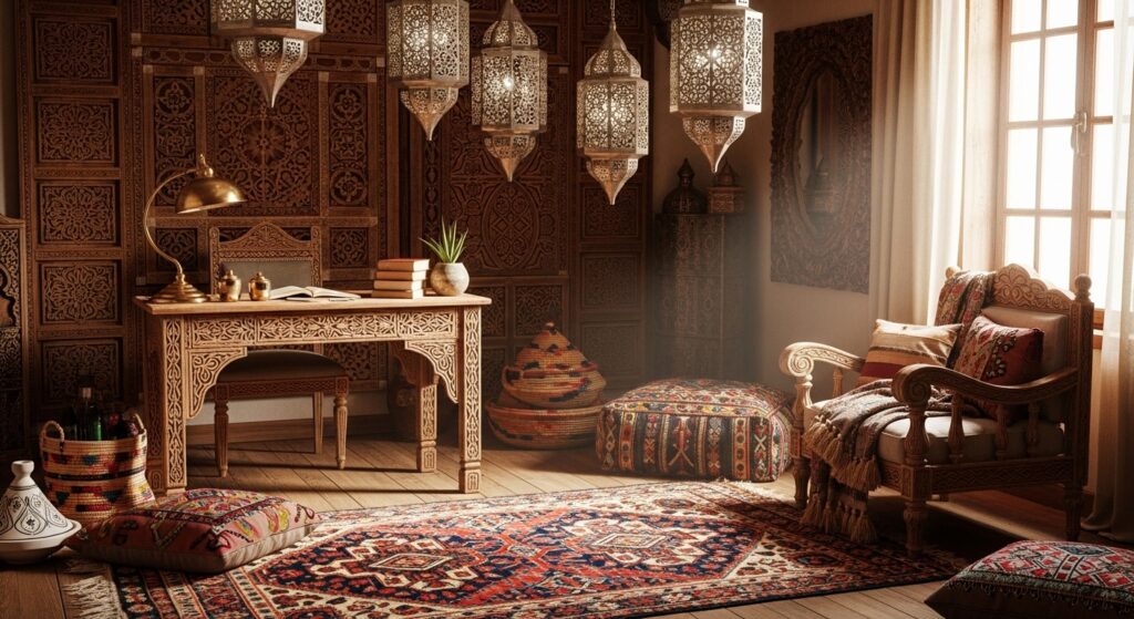 Use Moroccan rugs, lanterns, and carved wood accents to add global flair. The mix of patterns and earthy hues creates an exotic, soulful workspace with cultural warmth.