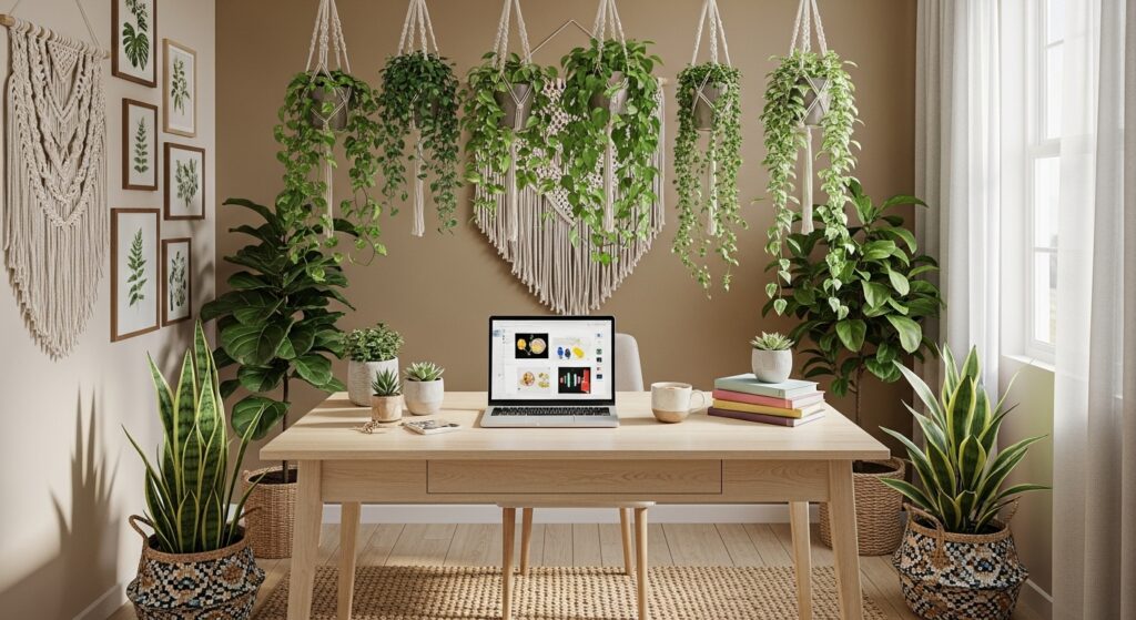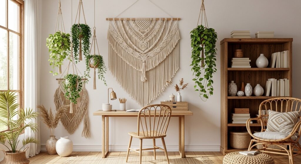 Add macramé wall hangings or plant holders to your office decor. These handmade pieces bring texture and artistry, instantly making your space feel cozy and creative.