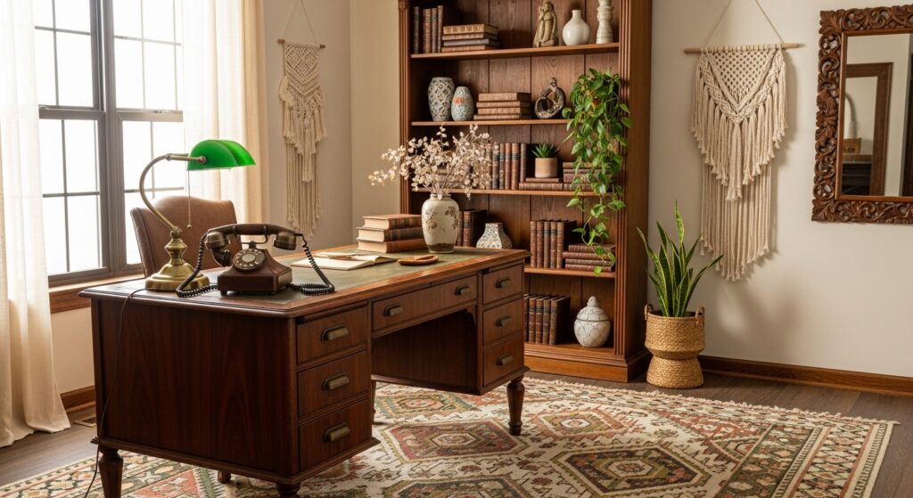Mix vintage furniture with boho accessories for character and charm. An antique desk, woven rug, and brass lamp blend old-world style with free-spirited elegance.
