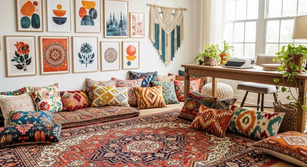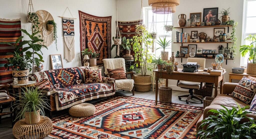 Incorporate cultural textiles like kilim rugs, woven baskets, and tribal prints. This globally inspired design celebrates diversity while keeping a relaxed aesthetic.