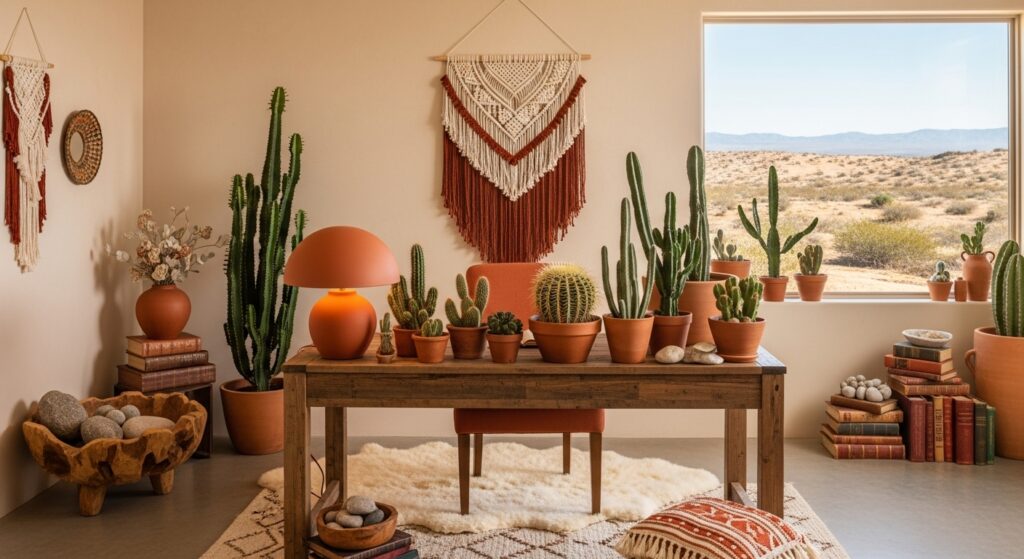 Capture desert hues with warm oranges, browns, and sandy neutrals. Add cacti, terracotta pots, and woven light fixtures for a sun-baked Southwest vibe.