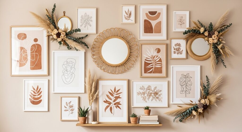 Create a gallery wall featuring art prints, mirrors, and dried florals. Mix frames of different textures — wood, brass, and rattan — for a curated yet relaxed boho aesthetic.
