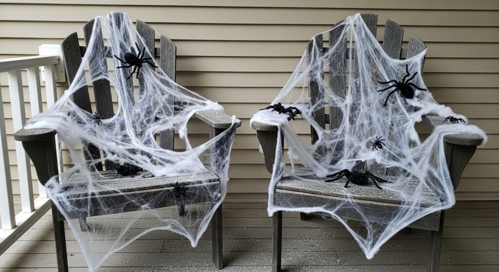 Cover your porch furniture with cobwebs and fake bugs. It makes your home look abandoned and haunted — a simple but effective Halloween twist.