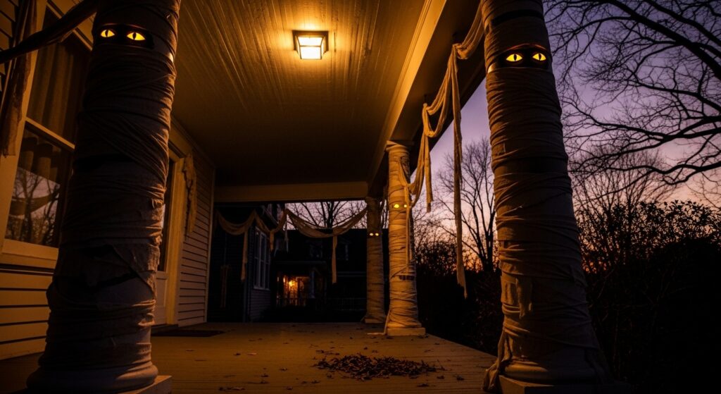 Wrap porch columns or posts with white cloth or bandages to resemble mummies. Add glowing eyes made from LEDs for a creepy nighttime effect.