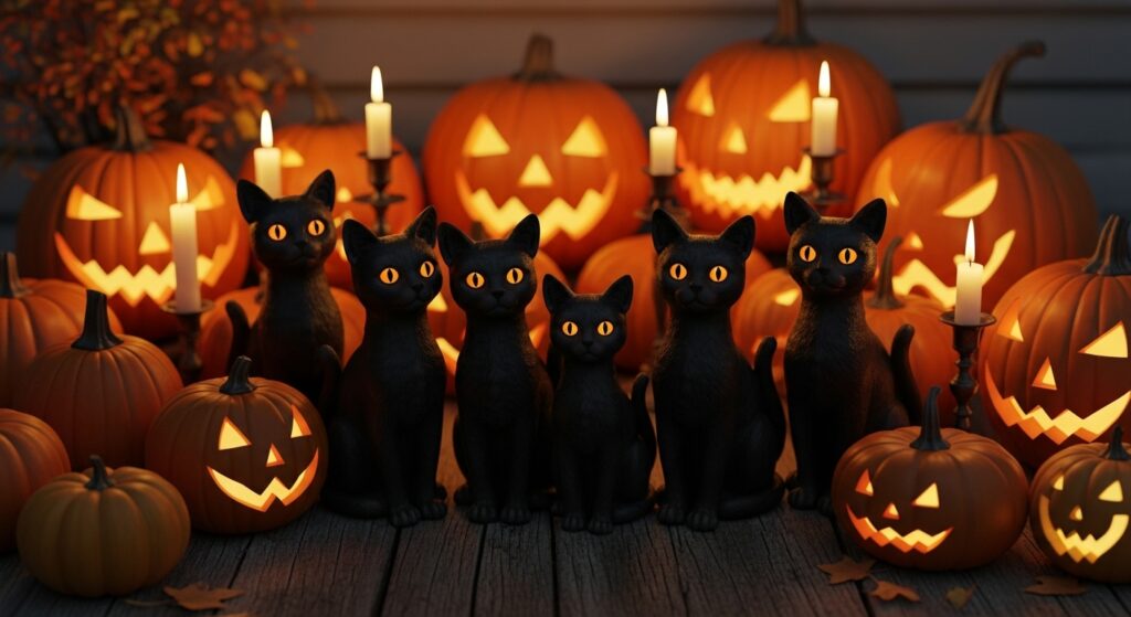 Add black cat statues or cutouts near your entryway. Their glowing eyes and sleek shapes add subtle yet spooky energy to your porch setup.
